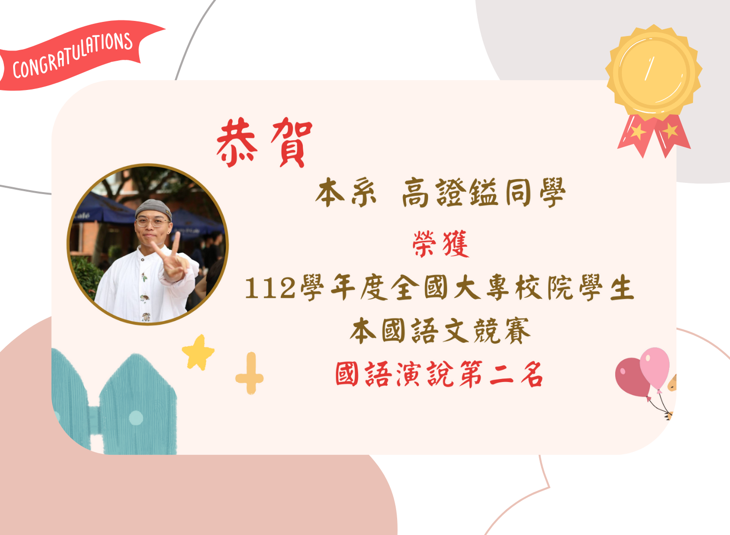 ㊗️高證鎰同學,榮獲「112學年度全國大專校院學生本國語文競賽」國語演說第二名