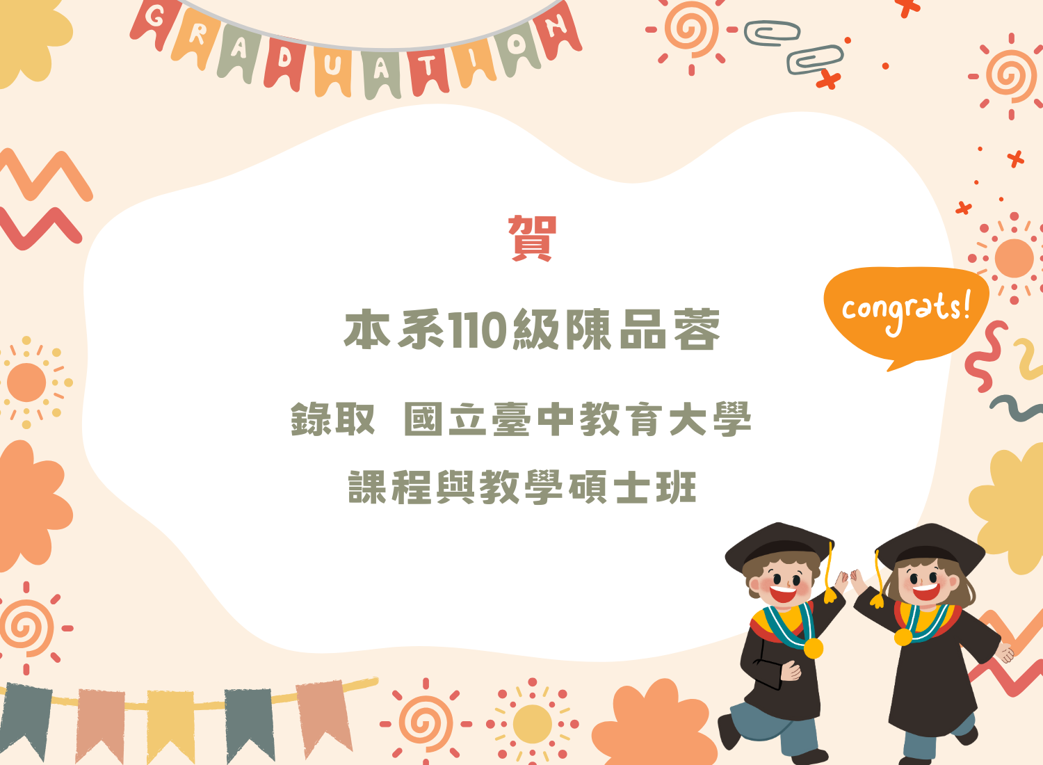 賀!110級陳品蓉同學 錄取 國立臺中教育大學 課程與教學碩士班