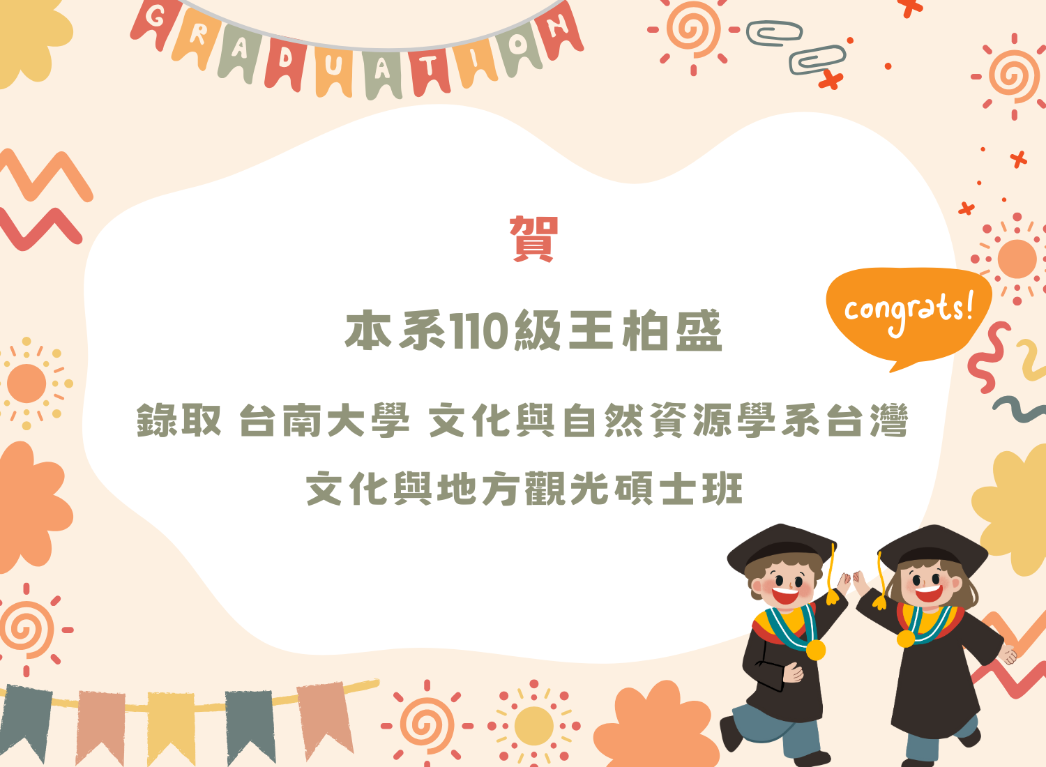 賀!110級王柏盛同學 錄取 台南大學 文化與自然資源學系台灣文化與地方觀光碩士班