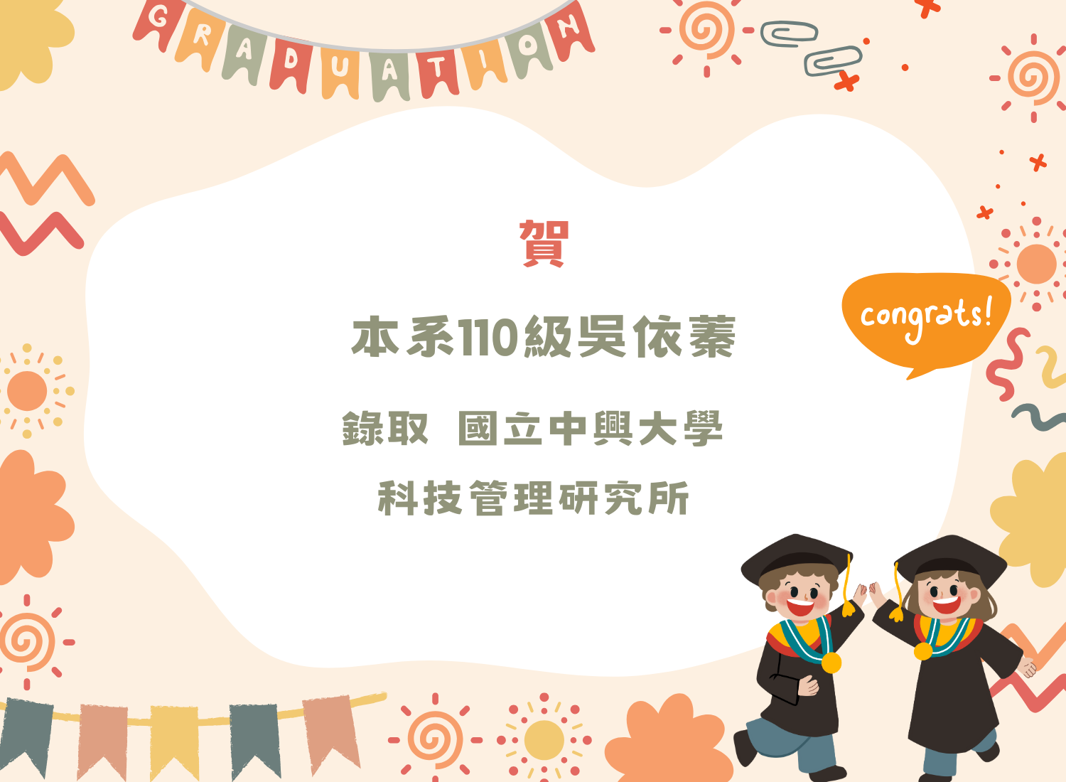 賀!110級吳依蓁同學 錄取 中興大學 科技管理研究所